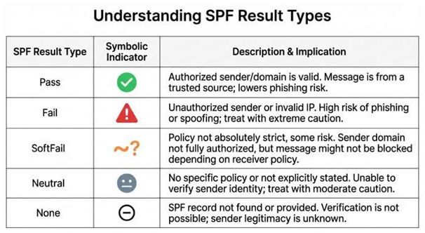 SPF results determine the authorization status of an email sender, categorizing it into various outcomes: Pass means the sender is authorized, Fail indicates the sender lacks authorization, SoftFail suggests a degree of suspicion without outright rejection, Neutral shows that there is no strict policy in place, and None implies that no SPF record exists. These results assist receiving servers in making informed choices about whether to accept, flag, or decline incoming emails according to the domain’s authentication policies.